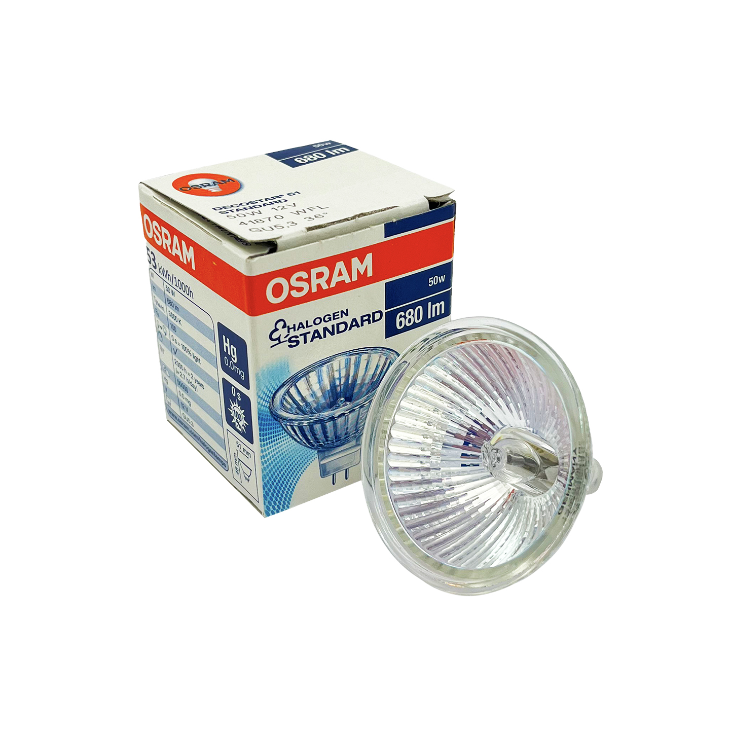 لامپ هالوژن کاسهای 50 وات 12 ولت (مدل MR16) با پایه سوزنی GU5.3، از سری DECOSTAR 51 برند معتبر اسرام (OSRAM)، یک منبع نوری باکیفیت و تخصصی برای نورپردازی متمرکز است. این لامپ به دلیل داشتن یک رفلکتور دیکروئیک (Dichroic Reflector) میتواند تا 66% از گرمای تولید شده را به عقب هدایت کند و پرتو نور را خنک نگه دارد. کد 41870 معمولاً به مدلهای Wide Flood (WFL) با زاویه تابش 36 درجه اشاره دارد. این لامپ برای استفاده در چراغهای توکار، اسپات لایتها و نورپردازی تأکیدی ایدهآل است.